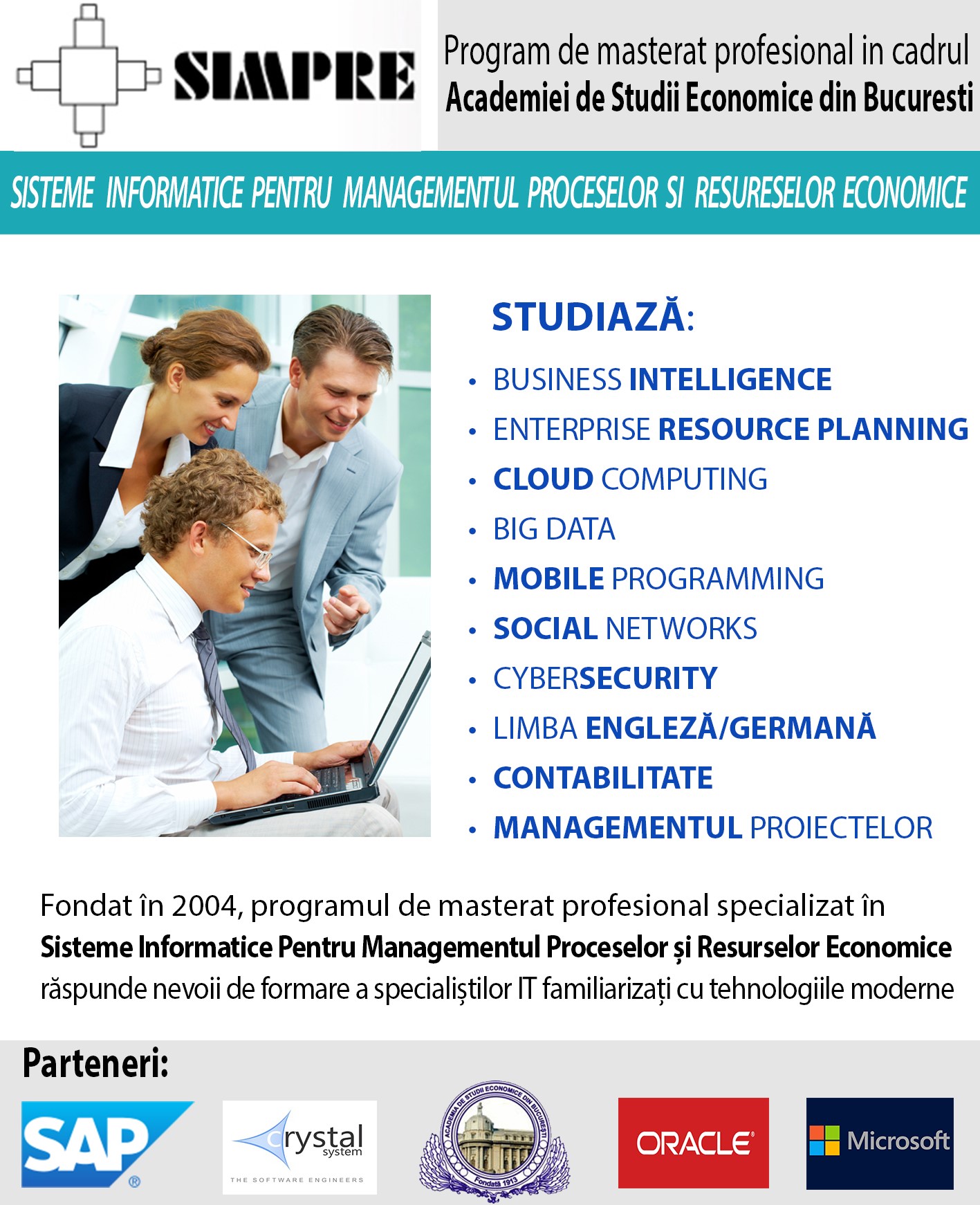 Fondat in 2004, programul de masterat S.I.M.P.R.E. răspunde nevoii de formare a specialiștilor IT familiarizați cu tehnologiile moderne.